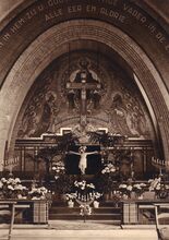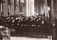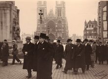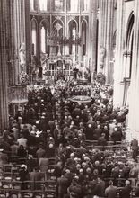 De Sint Petrus en Pauluskerk, een begrafenismis is bezig. Vooraan links, Pierre Van Outryve d'Ydewalle, provinciegoeverneur. Rechts, minister P.W. Segers. Op de tweede rij, burgemeester Henri Serruys