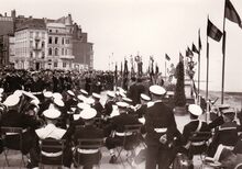 Zeeheldenplein,de stadsharmonie luistert de Zeewijding op.Links de hoek Van Iseghemlaan.