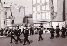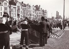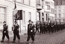 Een groep oudstrijders,van de sluikpers,gaat de helling van de Paketbotenkaai op nabij het station.Op de achtergrond (links) het Hazegras.