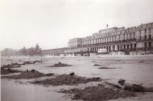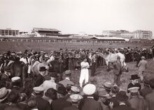 Paardenprijskamp op de Wellingtonrenbaan.Rechtsachteraan het Thermenhotel en de Koninklijke gaanderijen.