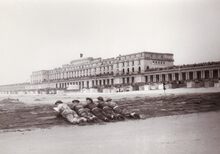 Soldaten,op oefening,liggen in volle dekking achter een golfbreker aan het Thermenpaleis.Er is grote belangstelling voor het gebeuren van op de dijk.