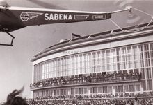 Een helicopter van SABENA landt (of stijgt op) onder massale belangstelling tijdens een demonstratievlucht aan het kursaal bij Petit Nice.