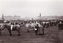 Een rij "brabanders" tijdens een paardenprijskamp op de Wellingtonrenbaan.Op de achtergrond links het Thermenpaleis,rechts de Sportstraat.