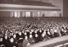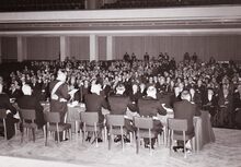 Bijeen komst van de Kajotters in het kursaal,de zaal zit bomvol.Op de eerste rij rechts bisschop DESMEDT,naast hem deken BUTAYE,dan een onbekende en vervolgens schepen Kamiel DEHOUCK.