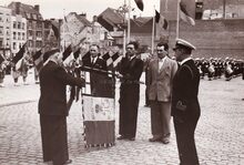 Tijdens een plechtigheid op het Wapenplein op de koloniale dag wordt het vaandel der navy oudstrijders gedecoreerd.