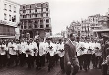Een afdeling van de rijkswacht defileert voorbij het monument der gesneuvelden op het Sint Petrus en Paulusplein.Op deachtergrond is te zien dat de heropbouw na de vernielingen van W.O. II ook hier is begonnen.