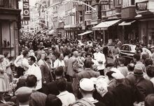Een begrafenisstoet,waarschijnlijk van een hoog marineman, in de Stuiverstraat en de Torhoutse steenweg,op de achtergrond het Sinte Catharinaplein. Op de hoek was cafΓ© "Sportwereld",er naastΒ een telefoonmast.