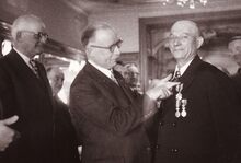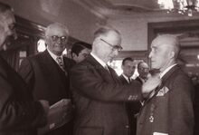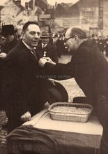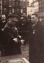 Ter gelegenheid van de viering van het 50 jarig bestaan van (?) in "La Renommée" op de Albert I Promenade wordt een onbekende gedecoreerd door burgemeester Hendrik SERRUYS.