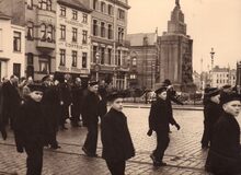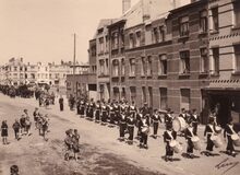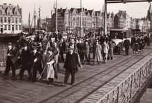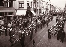 Begrafenisstoet op de Nieuwpoortsesteenweg ter hoogte van de Maria-Theresiastraat (links). Op de achtergond het kruispunt Petit Paris.