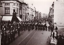 Ibisjongens en oudstrijders defileren voorbij het monument der gesneuvelden op het Sint Petrus en Paulusplein.Uiterst links een gedeelte van het gekende "Waterhuis" op de achtergrond links de Jozef II straat.