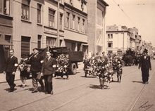 De begrafenisstoet van Ernest Van Glabbeke op de Nieuwpoortsesteenweg ter hoogte van de Stuiverstraat. De Ibisjongens dragen bloemen. Links het tramdepot met een telefoonmast.