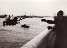 Een krans wordt door de heer MAENHOUT in de havengeul geworpen ter herdenking van de op zee tijdens de wereldoorlog(en) omgekomen zeelieden.