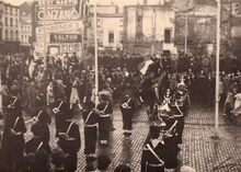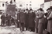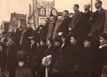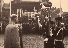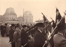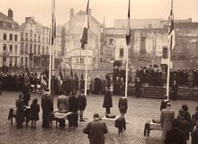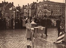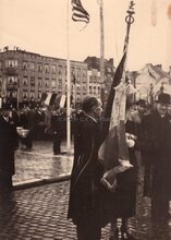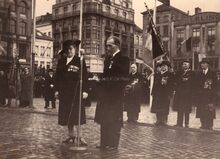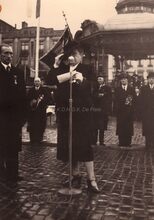 De eretribune tijdens een herdenkingsplechtigheid van W.O. I op het Wapenplein. Vooraan staat een rij oorlogsweduwen (?),links burgemeester Hendrik SERRUYS naast een Belgisch generaal.