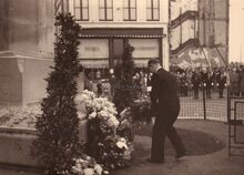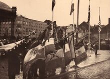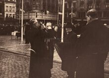 Vaderlandse plechtigheid op het Wapenplein. De oudstrijders mét vaandel staan opgesteld. Op de achtergrond Hotel "Central" op de hoek van de Louisa- en Brabantstraat.