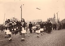 Stoet van oudstrijders op weg naar een plechtigheid aan het monument der gesneuvelden op het Sint Petrus en Paulusplein passeert aan de Kapellebrug.Op de achtergrond het politiekantoor van het Hazegras.