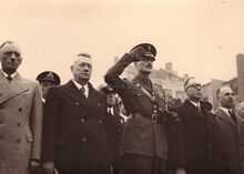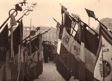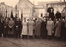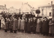 Herdenking V E dag (8 mei) op het Wapenplein,centraal op de tribune burgemeester Hendrik SERRUYS,vierde van links Henri EDEBAU,vijfde Emiel VROOME beiden schepen.Rechts de Kapellestraat.