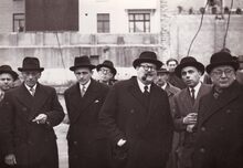 Centraal Minister Achiel Van Acker tijdens werfbezoek aan de bouw van het nieuwe postgebouw naar aanleding van het heien van de eerste paal. Links van hem provinciegoeverneur Pierre Van Outryve d'Ydewalle en Henri Edebau, schepen. Op de achtergrond de Poststraat