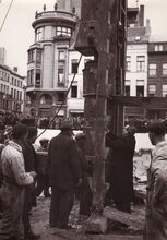 Minister Achiel Van Acker heit de eerste paal op de werf van het nieuwe postgebouw. Op de achtergrond de Wittenonnenstraat, hoek Hendrik Serruyslaan.