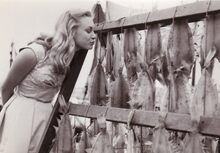 Belgische Feminaprijs voor de Film. De Franse filmacrice Mylène DEMONGEOT, geniet van het aroma van een rek "Schotse schullen",een der Oostendse delicatessen, aan de Visserskaai.