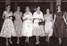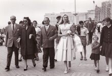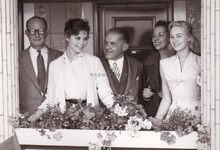 Enkele genodigden in het kursaal. Derde van rechts, Georgia Moll ,de Italiaanse filmactrice, en naast haar, de Franse filmactrice Mylene Demongeot.