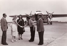 Bij haar aankomst op de luchthaven voor de Belgische Feminaprijs voor Film, wordt de Franse actrice Mylène Demongeot verwelkomd door luchthavencommandant Roose en burgemeester Adolf Van Glabbeke (rechts). Ac