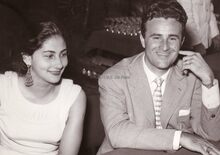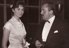 Bobbejaan Schoepen, de populaire zanger, en onbekende dame in het kursaal tijdens de Belgische Feminaprijs voor Film.