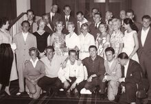 Een groep genodigden in het Kursaaal. Vooraan, tweede van links, Bobbejaan Schoepen, de populaire zanger.