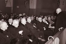 Pastoor-deken Joseph-Leo DESMET, houdt een toespraak voor kerkelijke en burgerlijke notabelen in de Koninklijke Schouwburg (Van Iseghemlaan). Links een jonge Jan PIERS, de latere burgemeester, onbekende en Hendrik SERRUYS, toenmalig burgemeester.