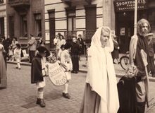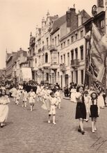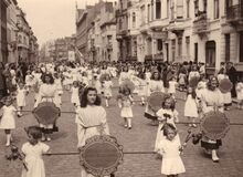 De processie van de Sint Jozefsparochie komt voorbij in de Rogierlaan.sommige kinderen hebben duidelijk een kleurtje gekregen.Ze worden begeleid door een zuster in het uniform van toen.Links hoek van de Euphrosina Beernaertstraat,achteraan het Leopold I plein.