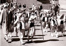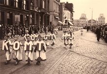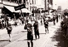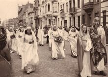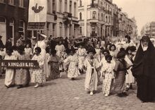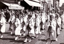 De stoet van de Zeewijding in de Dekenijstraat.Links de uitgang der werkhuizen van de gebroeders Valcke.Op de achtergrond de Jozef II-straat. De groep werd elk jaar gevormd door de eerste communicanten van het Klein College, rechts schoolhoofd Maurice Proot