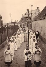 Processie op de Sint Jozefsparochie een groep meisjes in de Rogierlaan.