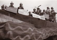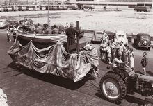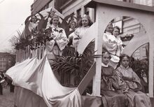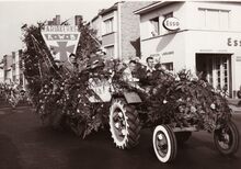 Een praalwagen van de KWB Mariakerke inΒ de stoet op de Nieuwpoortsesteenweg ter hoogte van het Esso tankstation Vervaeke, op de hoekΒ met de Elisabethlaan. Het EssoΒ tankstation werd uitgebaat door Marcel VervaekeΒ en zijnΒ echtgenoteΒ OdetteΒ GombertΒ van 1954 tot 1982.