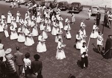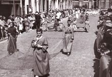 Groep die de jaarlijkse bedevaart naar het Kapelletje van Bredene uitbeeldde.Β Een makette van het Visserskapelletje wordt door vier meisjes meegedragen in de OmmegangΒ van de Zeewijding.Β Hier op de Visserskaai.