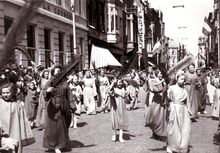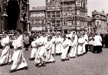 De Rogierlaan een processie van de Sint Jozefsparochie komt voorbij.