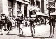 Palmzwaaiende "maagdekens" in de stoet van de Zeewijding in de Kapellestraat tegenaan de Vindictivelaan. Links een gedeelte van Hotel de la Couronne en de volkse bioscoop "Cameo". Achteraan de Jozef II-straat.