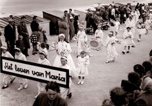 Processie op de Sint Jozefsparochie,maagdekens met het Mariabeeld in de Rogierlaan.