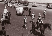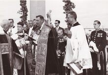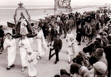 Mgr. DEΒ SMEDT,Β bisschop van Brugge, zegent de zee op het Zeeheldenplein tijdens de jaarlijkse Zeewijding. Rechts burgemeester Jan PIERS. De priester naast RenΓ© BUTAYE is E.H. Gilbert CAPELLE, priester leraar aan het OLV College en later pastoor te Lombardsijde. De priester, rechts op de voorgrond is E.H. de Vos de Molderghem, onderpastoor van de SS Petrus en Paulusparochie. Ook aanwezig schepen Frans VAN CAILLIE