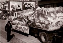 Een praalwagen uit de stoet der Zeewijding komt voorbij op de Visserskaai aan de parking der autobussen (bij het Montgomerydok).