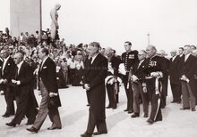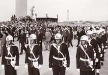 De notabelen op het Zeeheldenplein tijdens de jaarlijkse Zeewijding. In groot tenue op de tweede rij schepen FranΓ§ois VAN CAILLIE,Β burgemeester Jan PIERS, Henri SMISSAERT en schepen Kamiel DEHOUCK. Op de eerste rij, derde van links DESWAEF en ernaast Albert VANLERBERGHE;