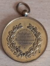 Op de keerzijde : een open lauwerkrans onderaan samengestrikt, centraal rondom boven ASSOCIATION GENERALE, horizontaal AU EMPLOYEES / AU CERCLE MIRY / RECONNAISSANCE / 29 JANVIER 1898