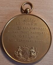Op de keerzijde : rondom boven S.M. LE ROI, horizontaal LEOPOLD II / INAUGURE LES NOUVELLES / INSTALLATIONS MARITIEMES / DβOSTENDE / LE 4 SEPTEMBRE 1905, hieronder het gekroonde wapenschild met keper en drie sleutels van de stad Oostende, geflankeerd door twee stadshouders, links meerman met zwaard naar links kijkend, rechts meermin met handspiegel naar rechts, alles geplaatst op palmbladeren samengebonden met lint, rondom rechtsonder gesigneerd DISPERSYN ET STIENON