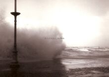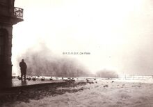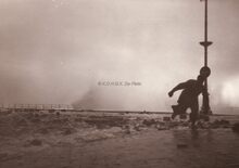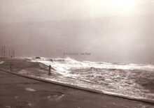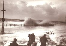 Albert I Promenade enkele moedige kijkers trotseren de stormwind om het schouwspel op de dijk mee te maken ter hoogte van de Vlaanderen helling.(?)