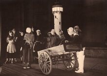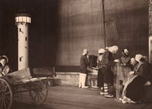 Scene uit de Oostendse Revue 1948,een viskar bij de "vlaggestok" (oude vuurtoren).Rechts worden visnetten (korren) hersteld.