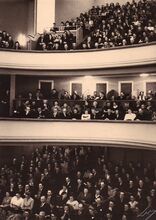 Β Zicht op de (bomvolle) zaal tijdens een voorstelling van de Oostendse Revue in de schouwburg aan de Van Iseghemlaan.