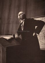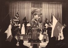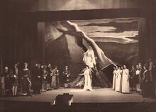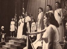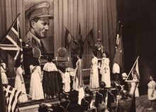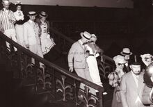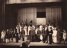 Tweede bedrijf : tafereel 7 : "BelgiΓ« in vrede en oorlog" : scene uit de Oostendse Revue 1948,spelers en vaandels groeten de beeltenis van Koning Leopold III (toen nog in ballingschap in Zwitserland).