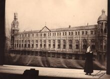 Eerste bedrijf : tafereel 6 : "Ons mooi stadhuis" : "Werdt het helaas afgebroken in weinig tijd dat men het toch heropbouw met wijs beleid" : scene uit de Oostendse Revue 1948,decor gevel Stadhuis 1940.