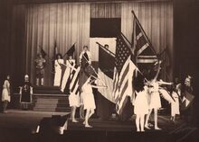 Tweede bedrijf : tafereel 7 : "BelgiΓ« in vrede en oorlog" : scene uit de Oostendse Revue 1948. Vlaggenparade met de vaandels van Groot-BrittanniΓ«, Verenigde Staten, BelgiΓ« enz.