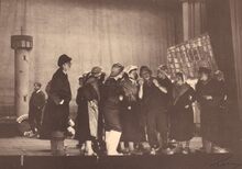 Tweede bedrijf : tafereel 7 : "BelgiΓ« in vrede en oorlog" : scene uit de Oostendse Revue,Britannia (?) met haar gezelschapsdames.