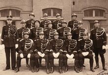 Groepsfoto van een sectie rijkswachters (met sjako) op de binnenkoer van de kazerne aan de Alfons Pieterslaan.