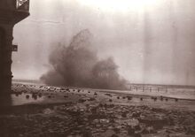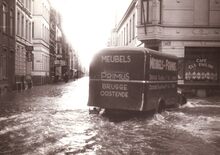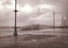 Zwaar stormweer,de golven slaan over aan de Albert I Β¨Promenade tegen hoek Capucijnenstraat (?).Veel stenen uit het wegdek gespoeld.